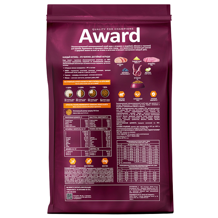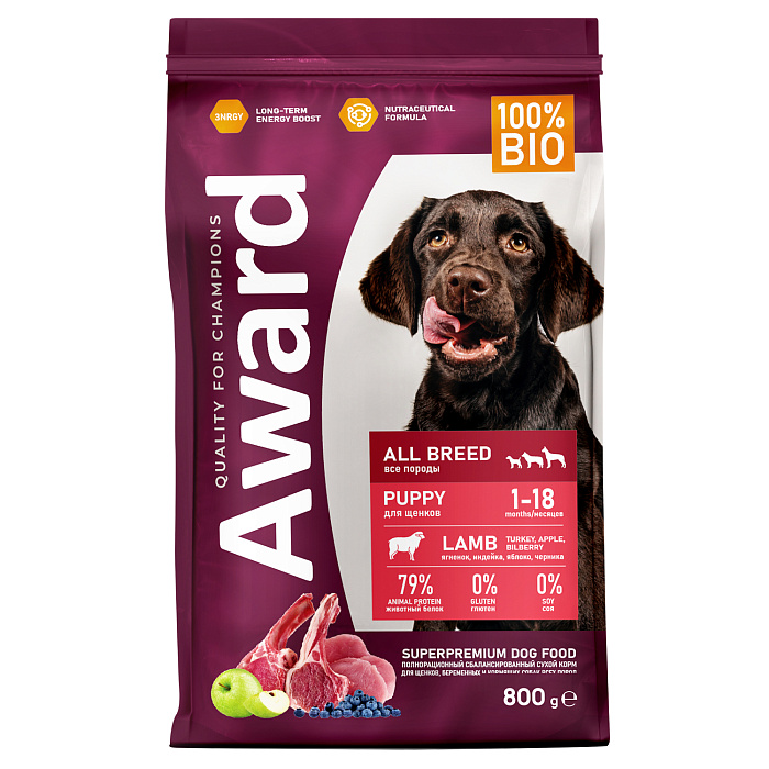 Сухой корм AWARD для щенков от 1 месяца, беременных и кормящих сук всех пород с ягненком и индейкой с добавлением яблока и черники 800 г.