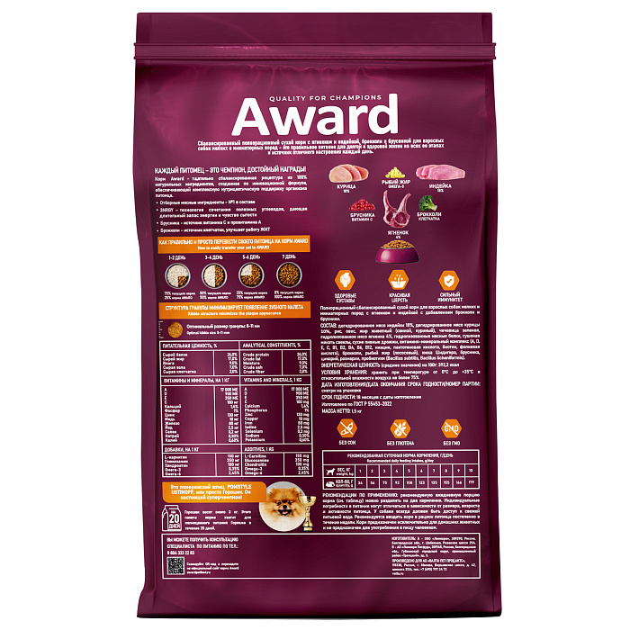 Сухой корм AWARD для взрослых собак мелких и миниатюрных пород с ягненком и индейкой с добавлением брокколи и брусники 1,5 кг.