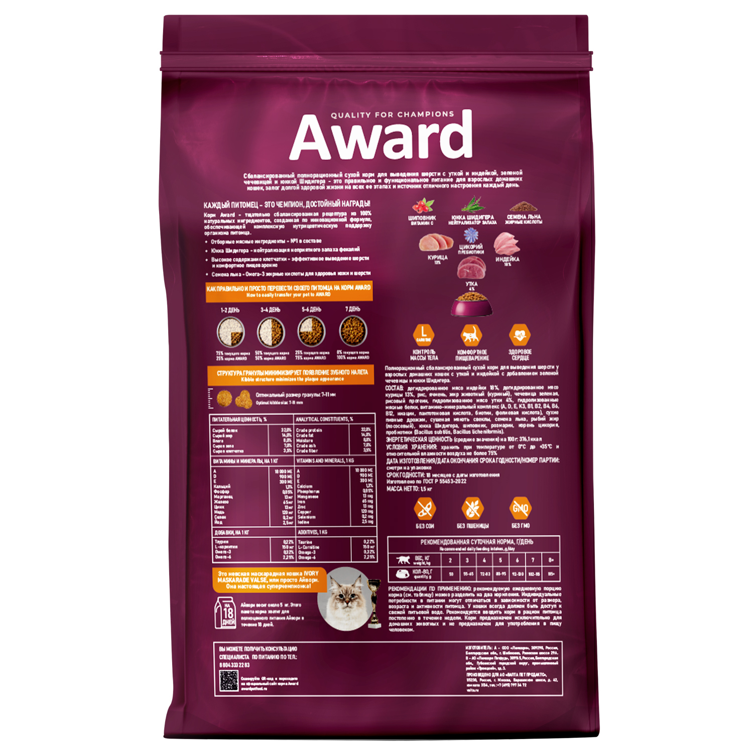 Сухой корм AWARD Hairball & Indoor для взрослых кошек для выведения шерсти с уткой и индейкой с добавлением зеленой чечевицы и Юкки Шидигера 1,5 кг.