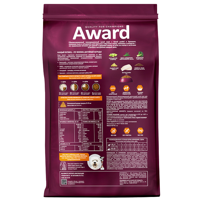 Сухой корм AWARD HYPO для взрослых собак всех пород с белой рыбой с добавлением брокколи, сельдерея и семян льна 2 кг.