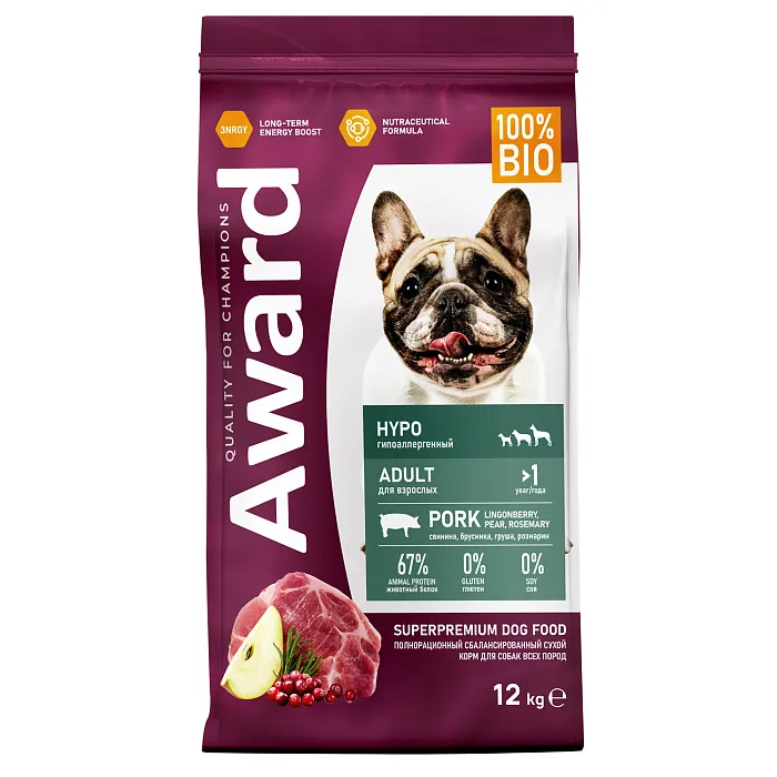 Сухой корм AWARD HYPO для взрослых собак всех пород со свининой с добавлением брусники, груши и розмарина 12 кг.