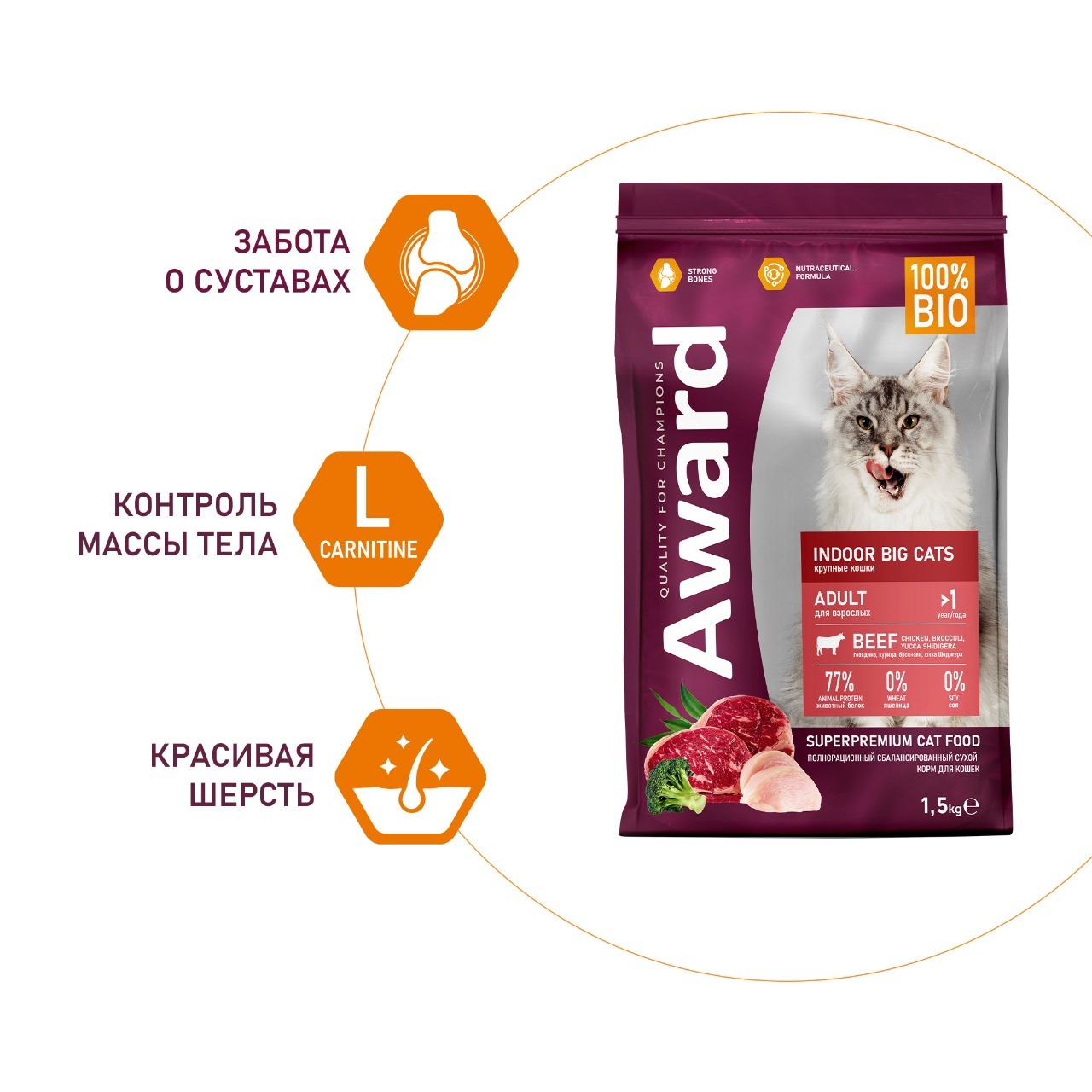 Сухой корм AWARD Indoor Big cats для взрослых домашних кошек крупных пород с говядиной и курицей с добавлением брокколи и юкки Шидигера 1,5 кг.