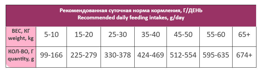 РЕКОМЕНДАЦИИ ПО ПРИМЕНЕНИЮ: рекомендуемую ежедневную порцию корма (см. таблицу) можно разделить на два кормления. индивидуальные потребности в питании могут отличаться в зависимости от размера, возраста и активности питомца. У собаки всегда должен быть доступ к свежей питьевой воде. Рекомендуется вводить корм в рацион питомца постепенно в течение недели. Корм предназначен исключительно для домашних животных и не предназначен для употребления в пищу человеком.