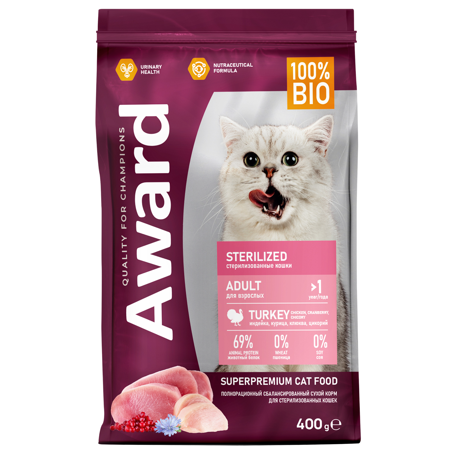 Сухой корм AWARD Sterilized для взрослых стерилизованных кошек с индейкой и курицей с добавлением клюквы и цикория 400 г.