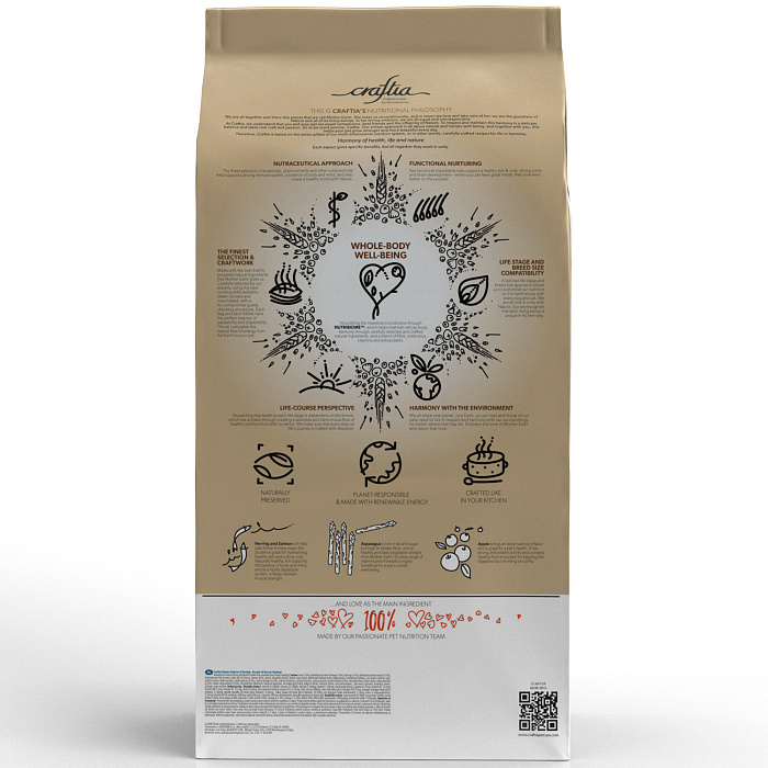 Состав кормов CRAFTIA прозрачен и понятен, отсутствуют скрытые добавки и сомнительные ингредиенты. Все, что заявлено в составе корма, гарантированно присутствует в каждой грануле. Собственный завод, сотни квадратных метров научно-исследовательских лабораторий, первоклассное сырье — все это позволяет создавать тщательно сбалансированный высокобелковый корм с холистическим подходом. Все компоненты корма подходят для употребления человеком и не содержат ГМО.