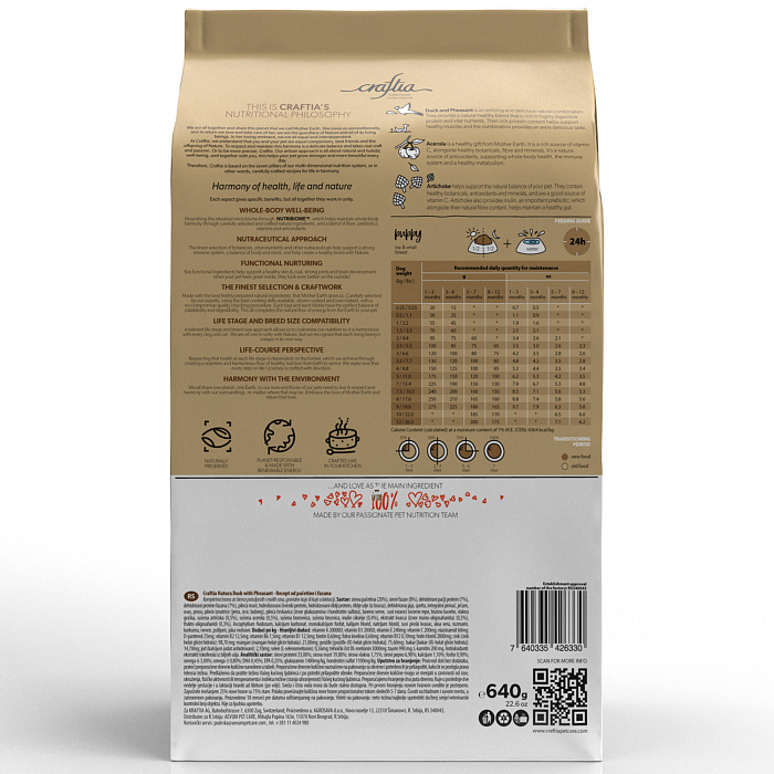 Состав кормов CRAFTIA прозрачен и понятен, отсутствуют скрытые добавки и сомнительные ингредиенты. Все, что заявлено в составе корма, гарантированно присутствует в каждой грануле. Собственный завод, сотни квадратных метров научно-исследовательских лабораторий, первоклассное сырье — все это позволяет создавать тщательно сбалансированный высокобелковый корм с холистическим подходом. Все компоненты корма подходят для употребления человеком и не содержат ГМО.