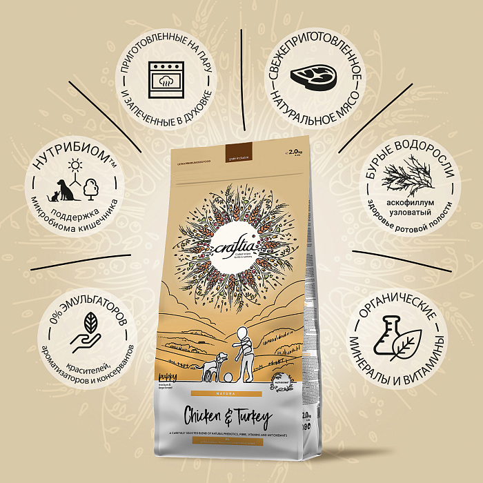 Сухой корм CRAFTIA NATURA для щенков средних и крупных пород из курицы и индейки 640 г