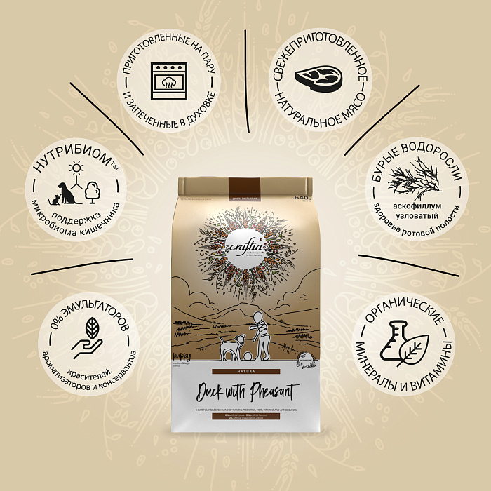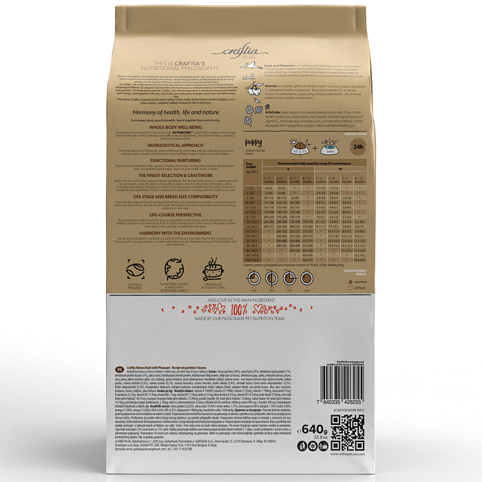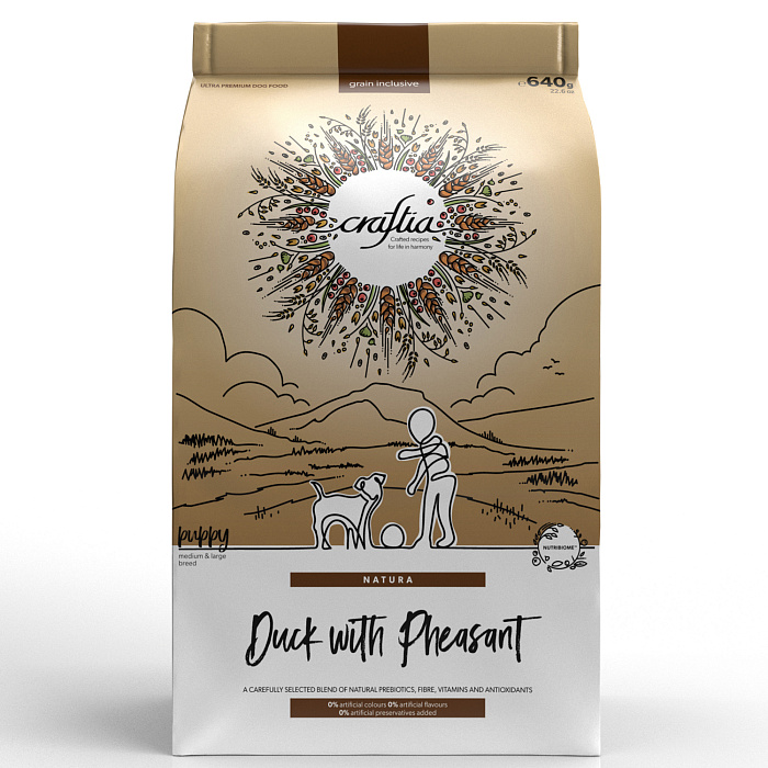 Сухой корм CRAFTIA NATURA для щенков средних и крупных пород из утки с фазаном 640 г