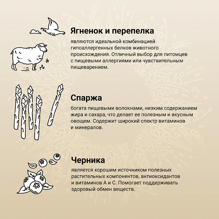 Основные источники белка в корме — свежее мясо ягненка и перепелки. Это редко встречающиеся ингредиенты, поэтому они подходят животным, склонным к возникновению аллергических реакций. Ягненок и перепелка — отличные источники незаменимых аминокислот, витаминов и минералов. Они легко усваиваются, помогают поддерживать оптимальный вес питомца, стабилизируют обмен веществ.