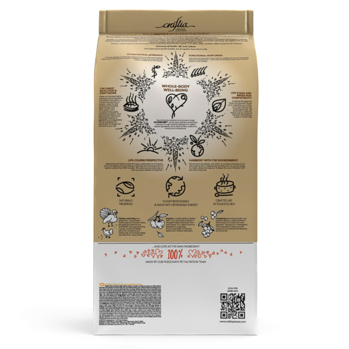 Состав кормов CRAFTIA прозрачен и понятен, отсутствуют скрытые добавки и сомнительные ингредиенты. Все, что заявлено в составе корма, гарантированно присутствует в каждой грануле. Собственный завод, сотни квадратных метров научно-исследовательских лабораторий, первоклассное сырье — все это позволяет создавать тщательно сбалансированный высокобелковый корм с холистическим подходом. Все компоненты корма подходят для употребления человеком и не содержат ГМО.
