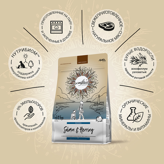 Сухой корм CRAFTIA NATURA для взрослых собак средних и крупных пород из лосося и сельди 640 г