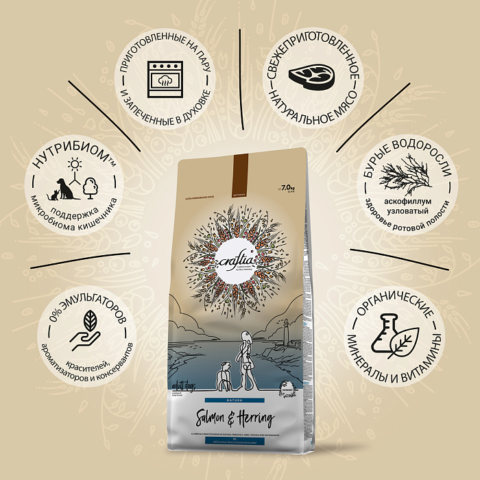 Сухой корм CRAFTIA NATURA для взрослых собак средних и крупных пород из лосося и сельди 7 кг
