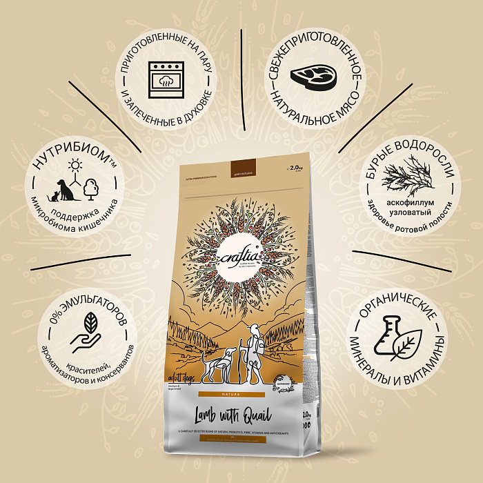 Сухой корм CRAFTIA NATURA для взрослых собак средних и крупных пород из ягненка с перепелкой 2 кг