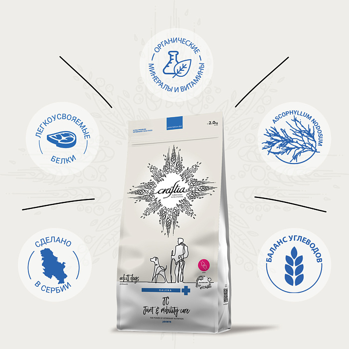 Craftia Galena Weight&Joint mobility Care - полнорационный диетический корм, разработан для поддержания здоровья суставов при остеоартрите.