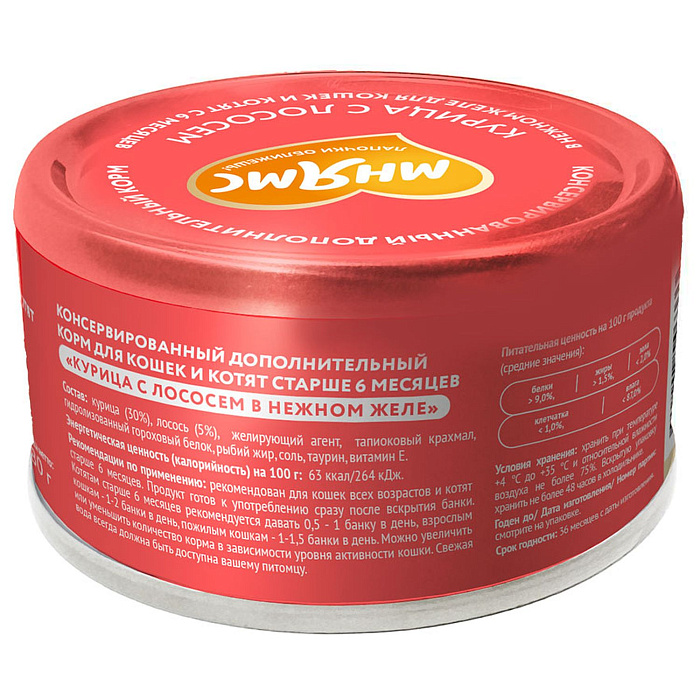 Консервированный дополнительный корм для кошек и котят старше 6 месяцев «Курица с лососем в нежном желе" 80 г. Содержит в составе натуральное мясо курицы и лосося, которое хорошо усваивается организмом и имеет высокую питательную ценность и вкусовую привлекательность. Корм "Курица с лососем в нежном желе" рекомендуется использовать в качестве дополнительного источника питания к основному рациону вашей кошки. При этом важно учитывать индивидуальные потребности животного, включая его вес, возраст и уровень активности. Котятам старше 6 месяцев рекомендуется давать - 40-80 г в день, взрослым кошкам - 80-160 г в день, пожилым кошкам - 80-120 г в день. Свежая вода всегда должна быть доступна вашему питомцу. Прекрасно подходит привередливым кошкам, а также питомцам со сниженным потреблением воды. «Мнямс» консервированный дополнительный корм для для кошек и котят старше 6 месяцев «Курица в нежном желе" гарантирует, что ваш питомец получит только качественный и вкусный продукт, который прекрасно разнообразит его рацион, поддержит здоровье и обеспечит энергией.