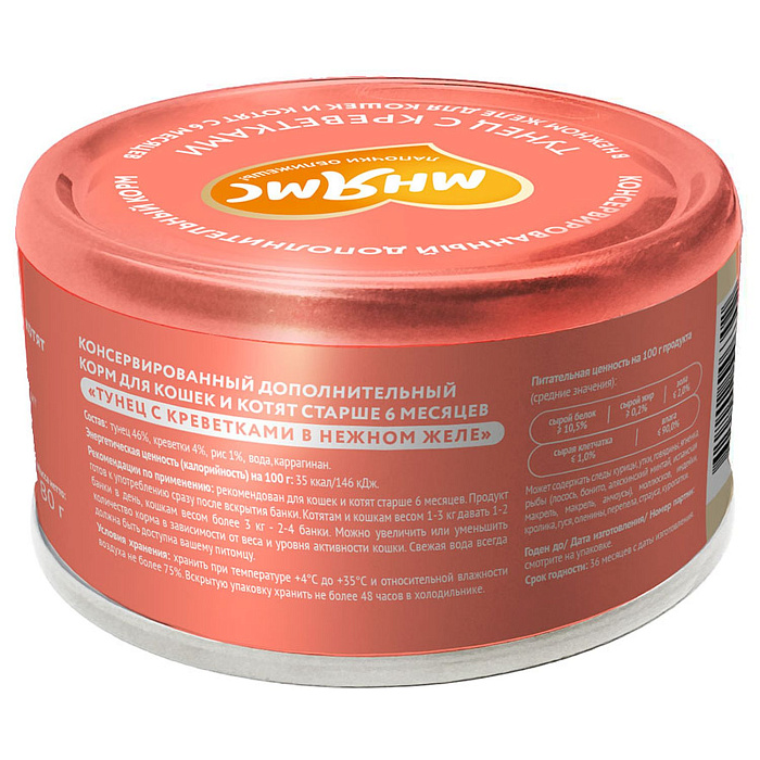 Консервированный дополнительный корм для кошек и котят старше 6 месяцев "Тунец с креветками в нежном желе" 80 г. Содержит в составе натуральное мясо стейковой части тунца и очищенные креветки, которые хорошо усваиваются организмом и имеют высокую питательную ценность и вкусовую привлекательность. Корм "Тунец с креветками в нежном желе" рекомендуется использовать в качестве дополнительного источника питания к основному рациону вашей кошки. При этом важно учитывать индивидуальные потребности животного, включая его вес, возраст и уровень активности. Кошкам весом 1-3 кг рекомендуется давать 1 банку в день, кошкам весом 4 кг и выше - 2-4 банки. Свежая вода всегда должна быть доступна вашему питомцу. Прекрасно подходит привередливым кошкам, а также питомцам со сниженным потреблением воды. «Мнямс» консервированный дополнительный корм для для кошек и котят старше 6 месяцев "Тунец с креветками в нежном желе" гарантирует, что ваш питомец получит только качественный и вкусный продукт, который прекрасно разнообразит его рацион, поддержит здоровье и обеспечит энергией.