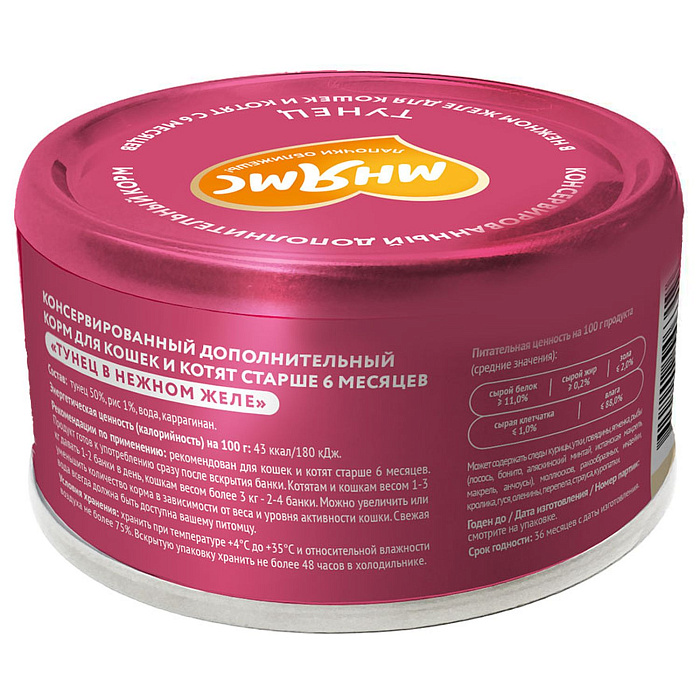 Консервированный дополнительный корм для кошек и котят старше 6 месяцев "Тунец в нежном желе" 80 г. Содержит в составе натуральное мясо стейковой части тунца, которое хорошо усваиваются организмом и имеет высокую питательную ценность и вкусовую привлекательность. Корм "Тунец в нежном желе" рекомендуется использовать в качестве дополнительного источника питания к основному рациону вашей кошки. При этом важно учитывать индивидуальные потребности животного, включая его вес, возраст и уровень активности. Кошкам весом 1-3 кг рекомендуется давать 1 банку в день, кошкам весом 4 кг и выше - 2-4 банки. Свежая вода всегда должна быть доступна вашему питомцу. Прекрасно подходит привередливым кошкам, а также питомцам со сниженным потреблением воды. «Мнямс» консервированный дополнительный корм для для кошек и котят старше 6 месяцев "Тунец в нежном желе" гарантирует, что ваш питомец получит только качественный и вкусный продукт, который прекрасно разнообразит его рацион, поддержит здоровье и обеспечит энергией.