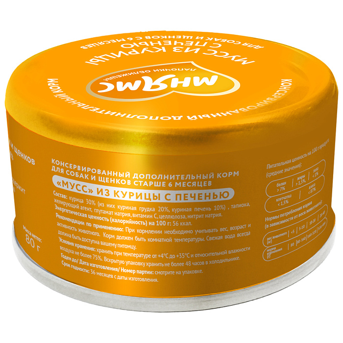 Консервированный дополнительный корм для собак и щенков старше 6 месяцев «мусс» из курицы с печенью 80 г. Содержит в составе животный белок высокого качества (курица 30% (из них куриная грудка 20%, куриная печень 10%), который хорошо усваивается организмом и способствует профилактике сердечно-сосудистых заболеваний, полиненасыщенные жирные кислоты для здорового метаболизма, тапиоку – безглютеновый источник углеводов, а также витамин С, который помогает поддерживать иммунную систему. «Мусс» из курицы с печенью рекомендуется использовать в качестве дополнительного источника питания к основному рациону вашей собаки. При этом важно учитывать индивидуальные потребности животного, включая его вес, возраст и уровень активности. Для собак разного веса предусмотрены различные нормы потребления, начиная от 80 г в день для собак весом до 5 кг и до 480 г для собак весом от 20 до 40 кг. Прекрасно подходит пожилым собакам, а также питомцам с аллергией на злаки в составе кормов. «Мнямс» консервированный дополнительный корм для собак и щенков старше 6 месяцев «мусс» из курицы с печенью гарантирует, что ваш питомец получит только качественный и вкусный продукт, который прекрасно разнообразит рацион любимца, поддержит его здоровье и жизненную энергию.