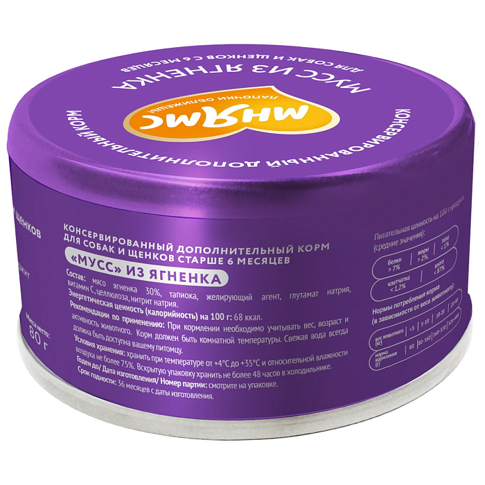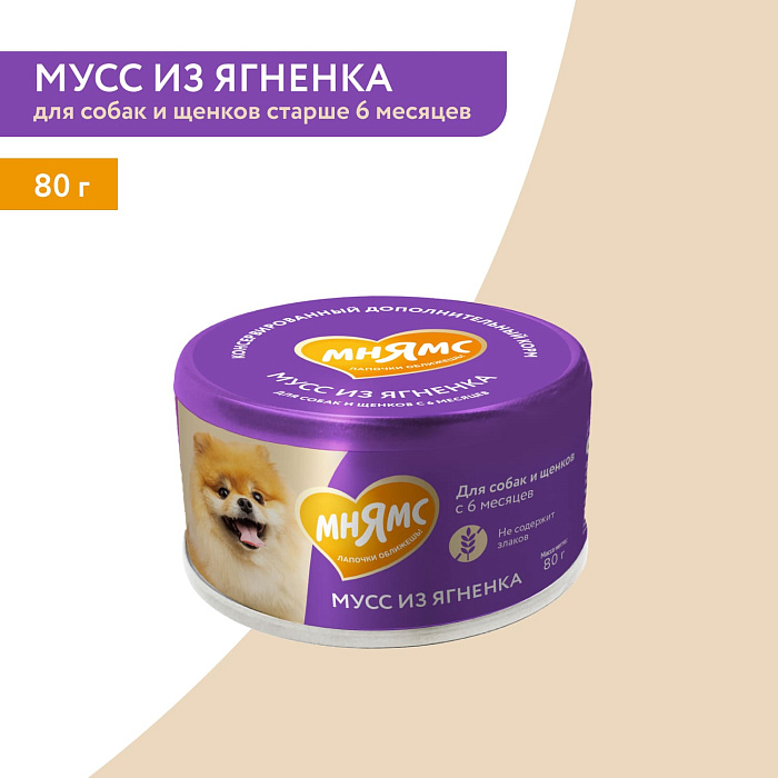Консервированный дополнительный корм для собак и щенков старше 6 месяцев «мусс» из ягненка 80 г. Содержит в составе животный белок высокого качества (мясо ягненка 30%), который легко усваивается и служит источником незаменимых аминокислот, необходимых для поддержания здоровья и активности питомца, тапиоку – безглютеновый источник углеводов, а также витамин С, который помогает поддерживать иммунную систему. «Мусс» из ягненка рекомендуется использовать в качестве дополнительного источника питания к основному рациону вашей собаки. При этом важно учитывать индивидуальные потребности животного, включая его вес, возраст и уровень активности. Для собак разного веса предусмотрены различные нормы потребления, начиная от 80 г в день для собак весом до 5 кг и до 480 г для собак весом от 20 до 40 кг. Прекрасно подходит пожилым собакам, а также питомцам с чувствительным пищеварением и аллергией на курицу или злаки в составе кормов. «Мнямс» консервированный дополнительный корм для собак и щенков старше 6 месяцев «мусс» из ягненка гарантирует, что ваш питомец получит только качественный и вкусный продукт, который прекрасно разнообразит рацион любимца, поддержит его здоровье и жизненную энергию.
