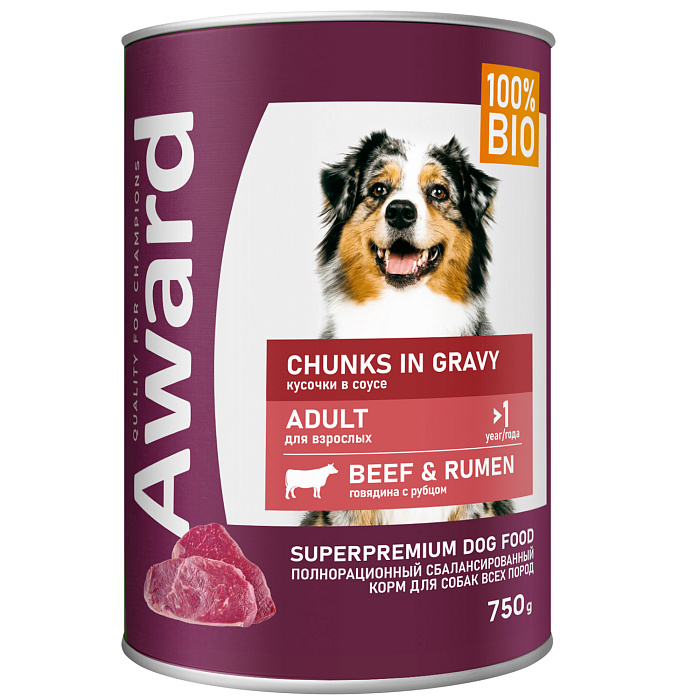 Влажный корм AWARD для взрослых собак кусочки с говядиной и рубцом в соусе 750 г
