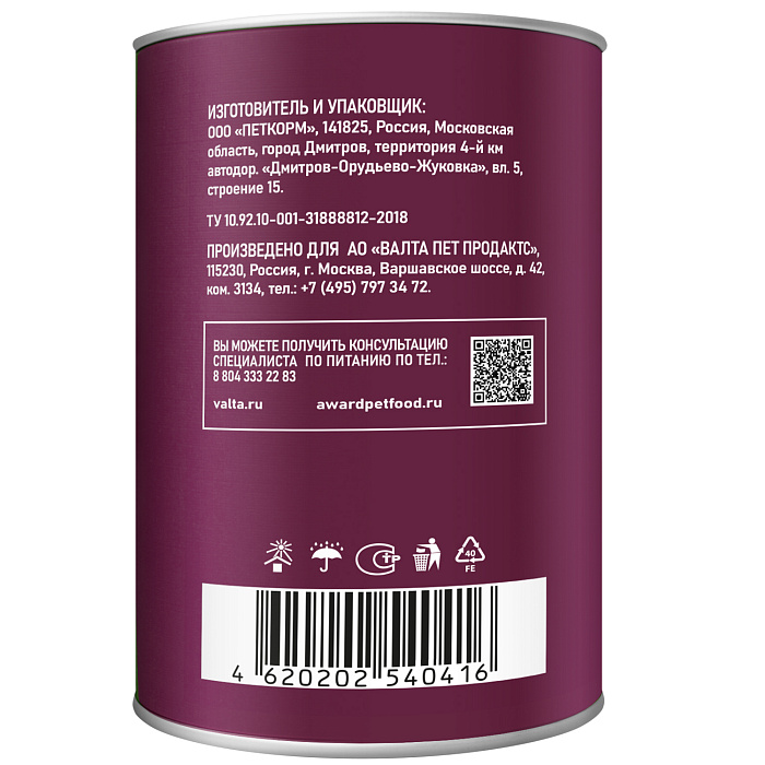 Состав: мясо и мясные субпродукты 45% (говядина не менее 12%), рубец 4%, рис не более 2,7%, витамины и минералы, льняное масло 0,5%, экстракт эхинацеи.