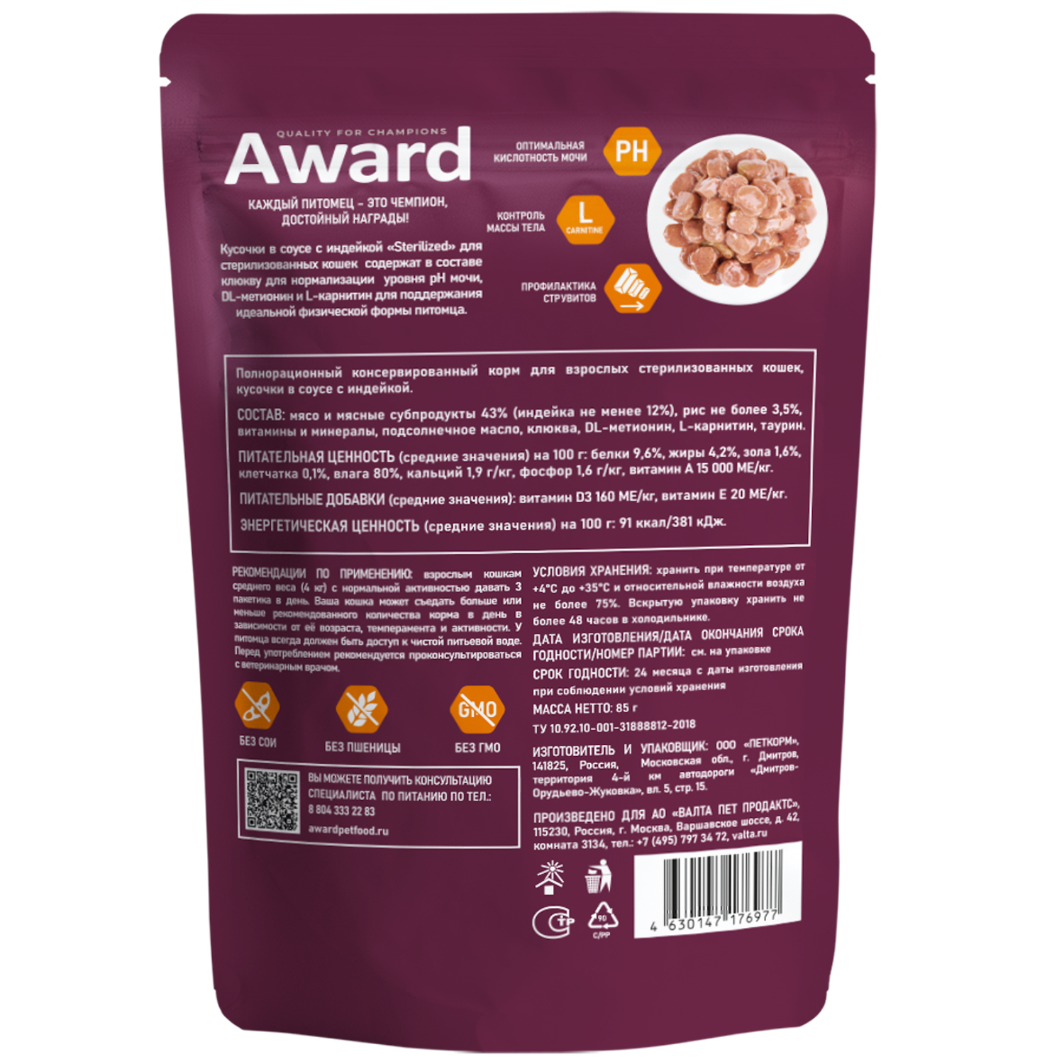 AWARD Полнорационный консервированный корм «Sterilized» для взрослых стерилизованных кошек, кусочки в соусе с индейкой 85 г.