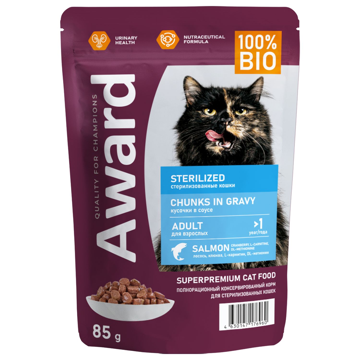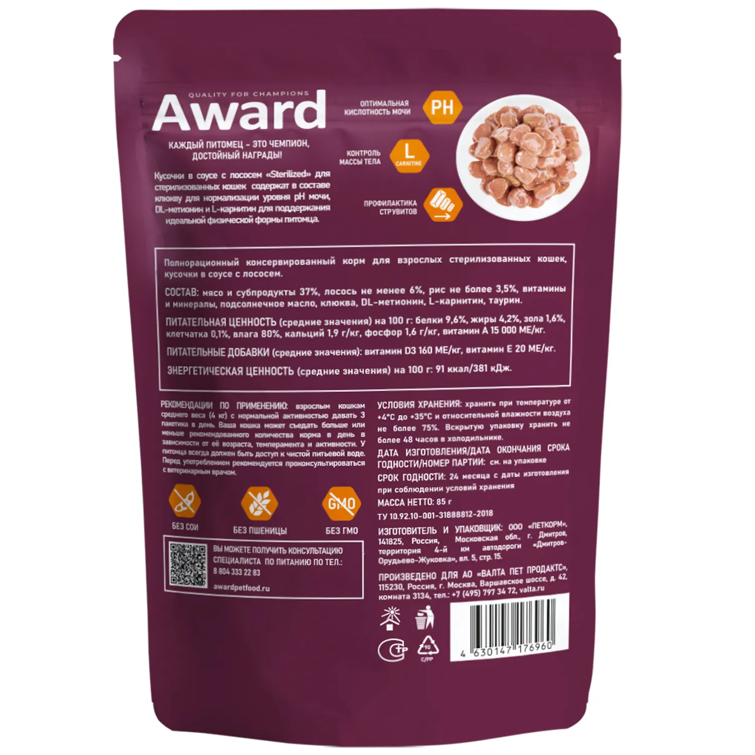AWARD Полнорационный консервированный корм «Sterilized» для взрослых стерилизованных кошек, кусочки в соусе с лососем 85 г.
