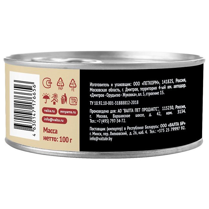 Питательная ценность на 100 г: белки 12,5%, жиры 10%, клетчатка 0,3%, зола 2,4%, кальций 0,22%, фосфор 0,18%, магний 0,015%, влага 73%, витамин А 6000 МЕ/кг, витамин D3 200 МЕ/кг, витамин Е 20 МЕ/кг, таурин 600 мг/кг, железо 40 мг/кг, медь 3 мг/кг, марганец 2 мг/кг, цинк 35 мг/кг.