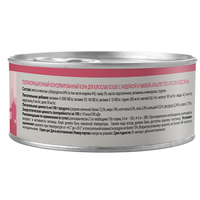 Полнорационный сбалансированный влажный корм с индейкой и тыквой для кошек старше 12 месяцев, созданный по мотивам блюд высокой кухни. "Паштет по-оксфордски" содержит высокое количество животного белка (69%), тыкву, таурин, а также все необходимые витамины и минералы для поддержания здоровья и активности кошки на протяжении всей ее жизни. Без ГМО, сои, искусственных красителей и ароматизаторов.