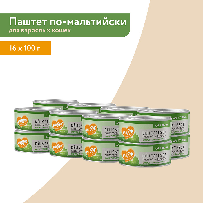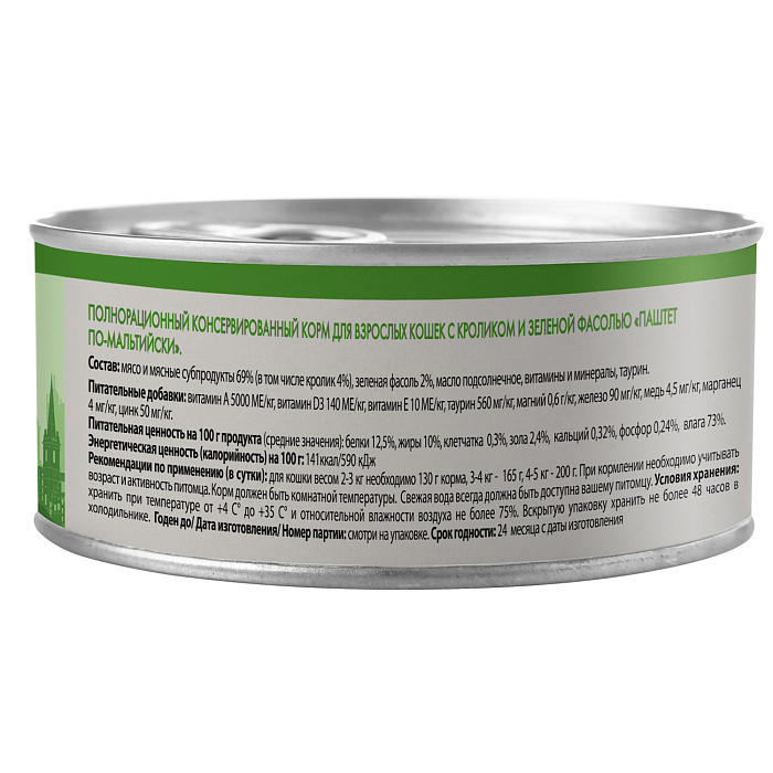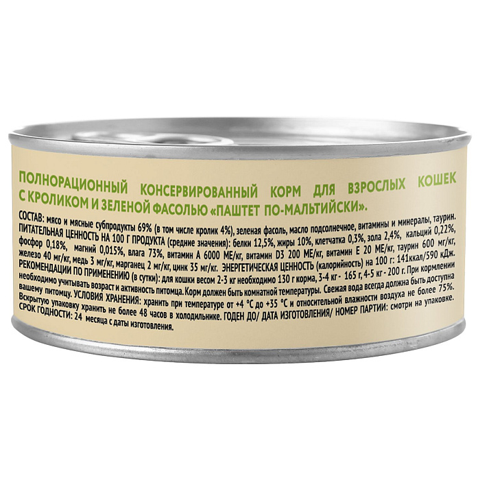Полнорационный сбалансированный влажный корм с кроликом и зеленой фасолью для кошек старше 12 месяцев, созданный по мотивам блюд высокой кухни. "Паштет по-мальтийски" содержит высокое количество животного белка (69%), зеленую фасоль, таурин, а также все необходимые витамины и минералы для поддержания здоровья и активности кошки на протяжении всей ее жизни. Без ГМО, сои, искусственных красителей и ароматизаторов.