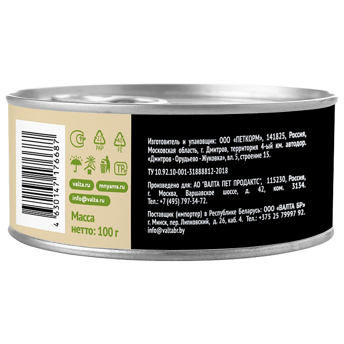 Питательная ценность на 100 г: белки 12,5%, жиры 10%, клетчатка 0,3%, зола 2,4%, кальций 0,22%, фосфор 0,18%, магний 0,015%, влага 73%, витамин А 6000 МЕ/кг, витамин D3 200 МЕ/кг, витамин Е 20 МЕ/кг, таурин 600 мг/кг, железо 40 мг/кг, медь 3 мг/кг, марганец 2 мг/кг, цинк 35 мг/кг.