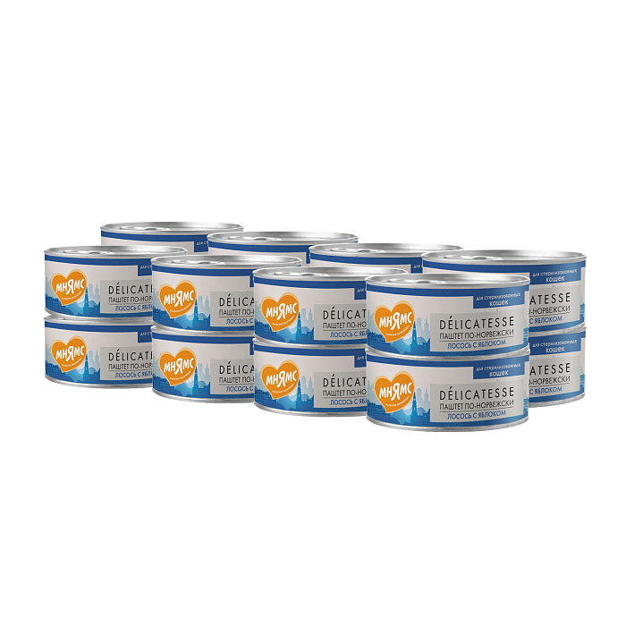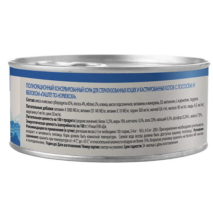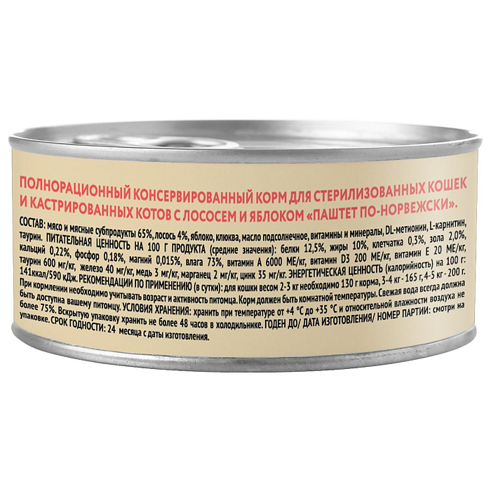 Полнорационный сбалансированный влажный корм с лососем и яблоком для стерилизованных кошек и кастрированных котов старше 12 месяцев, созданный по мотивам блюд высокой кухни. "Паштет по-норвежски" содержит высокое количество животного белка (65%), лосось, яблоко, клюкву, витамины и минералы, DL-метионин, L-карнитин, обеспечивающие контроль веса и снижающие риск развития мочекаменной болезни, а также незаменимую аминокислоту - таурин. Без ГМО, сои, искусственных красителей и ароматизаторов.