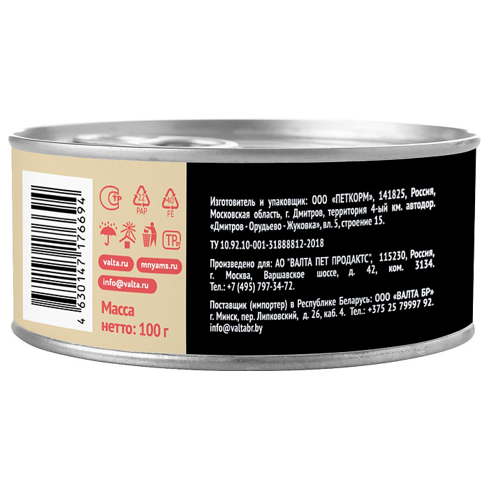 Питательная ценность на 100 г: белки 12,5%, жиры 10%, клетчатка 0,3%, зола 2,0%, кальций 0,22%, фосфор 0,18%, магний 0,015%, влага 73%, витамин А 6000 МЕ/кг, витамин D3 200 МЕ/кг, витамин Е 20 МЕ/кг, таурин 600 мг/кг, железо 40 мг/кг, медь 3 мг/кг, марганец 2 мг/кг, цинк 35 мг/кг.