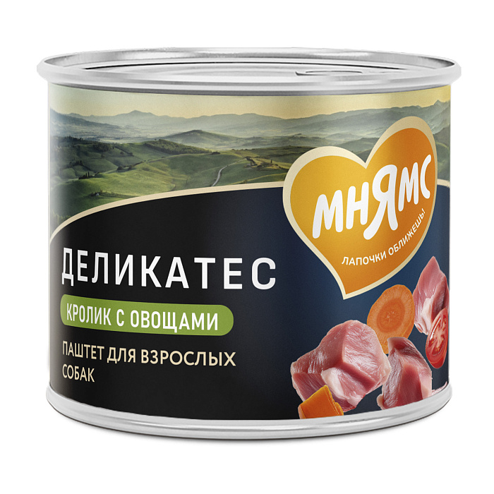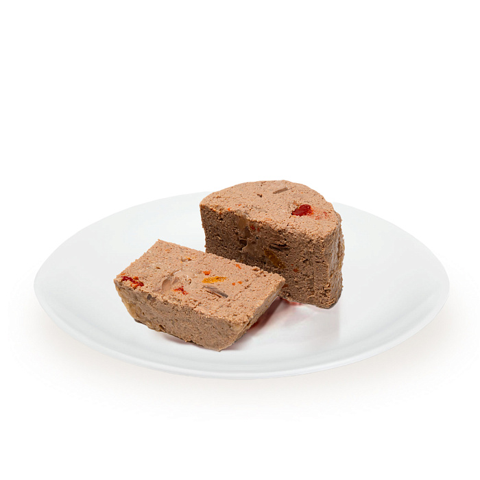 Состав: мясо и субпродукты 62% (курица 15%, кролик 15%), морковь 2%, томаты 2%, тыква 2%, паприка 2%, витамины, минеральные вещества, клетчатка свекловичная, льняное масло 0,1%.