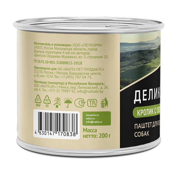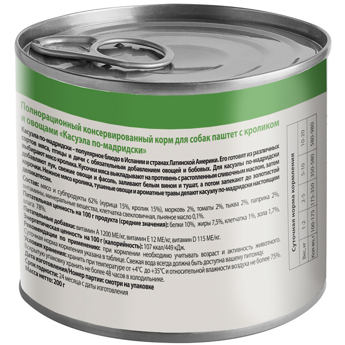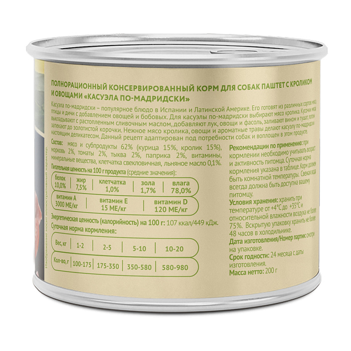 Полнорационный консервированный корм для собак "Касуэла по-мадридски". Паштет с кроликом и овощами. Суперпремиальный паштет с высоким содержанием мяса, созданный по мотивам культовых рецептов разных стран, адаптированных под собак всех пород. Касуэла по-мадридски – популярное блюдо в Испании и странах Латинской Америки. Его готовят из различных сортов мяса, птицы и дичи с обязательным добавлением овощей и бобовых. Для касуэлы по-мадридски выбирают мясо кролика. Кусочки мяса выкладывают на противень с растопленным сливочным маслом, затем добавляют лук, свежие овощи и фасоль, заливают белым вином и тушат, а потом запекают до золотистой корочки. Нежное мясо кролика, тушеные овощи и ароматные травы делают касуэлу по-мадридски настоящим деликатесом.