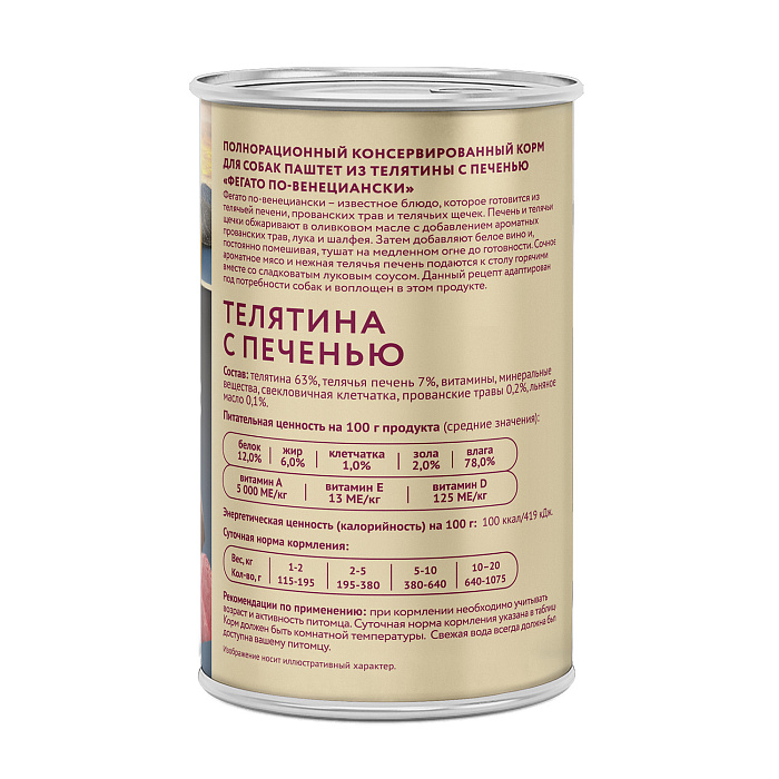 Полнорационный консервированный корм для собак "Фегато по-венециански". Паштет из телятины с печенью. Суперпремиальный паштет с высоким содержанием мяса, созданный по мотивам культовых рецептов разных стран, адаптированных под собак всех пород. Фегато по-венециански – известное блюдо, которое готовится из телячьей печени, прованских трав и телячьих щечек. Печень и телячьи щечки обжаривают в оливковом масле с добавлением ароматных прованских трав, лука и шалфея. Затем добавляют белое вино и, постоянно помешивая, тушат на медленном огне до готовности. Сочное ароматное мясо и нежная телячья печень подаются к столу горячими вместе со сладковатым луковым соусом.