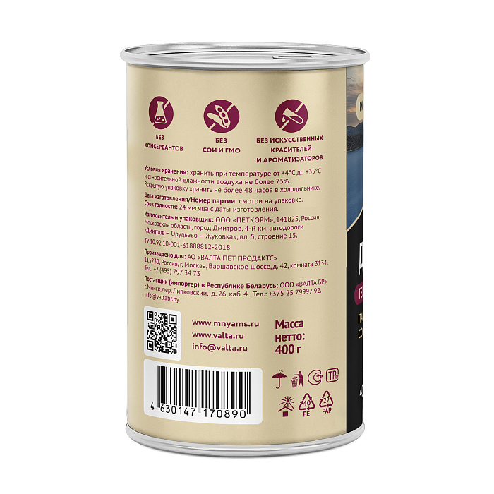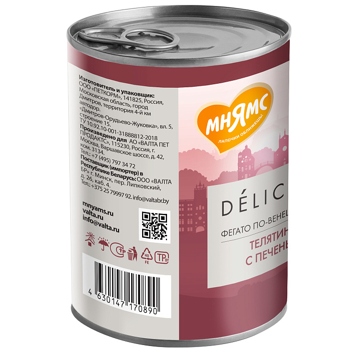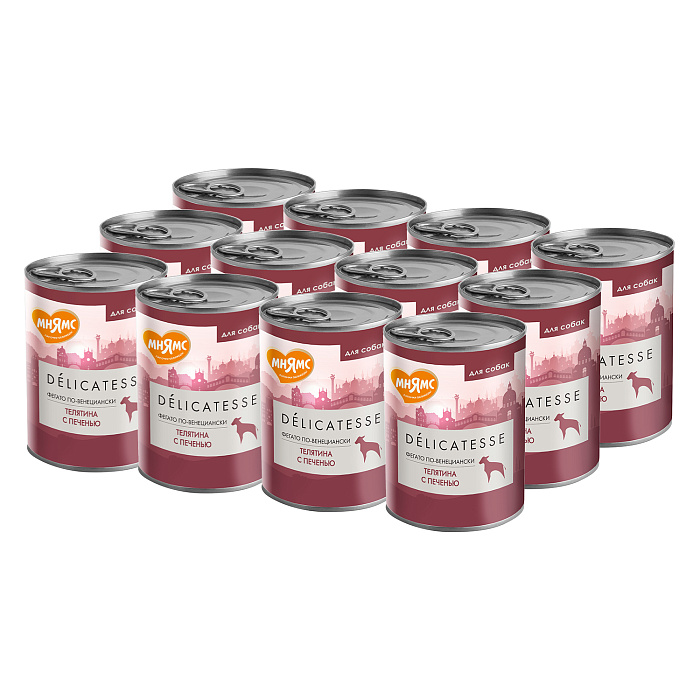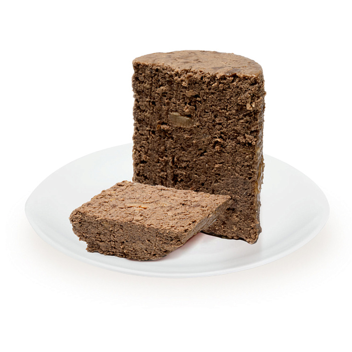 Состав: телятина 63%, телячья печень 7%, витамины, минеральные вещества, свекловичная клетчатка, прованские травы 0,2%, льняное масло 0,1%.