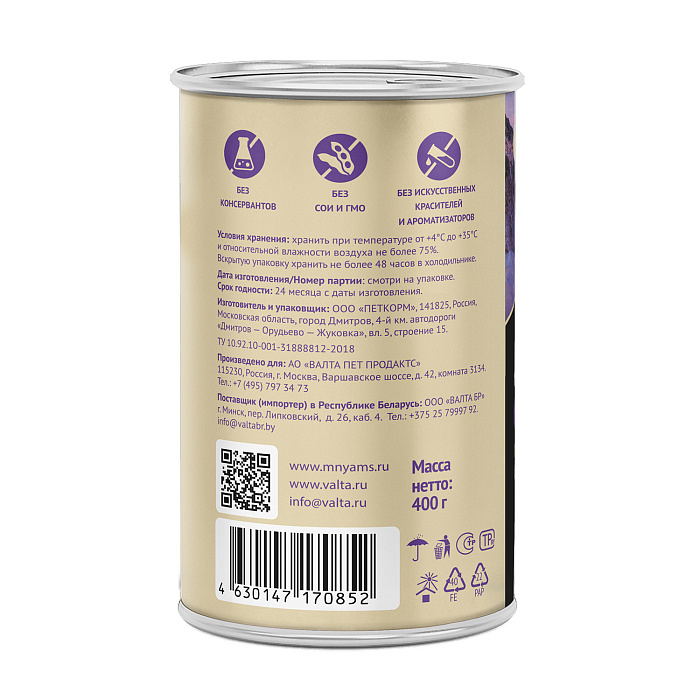 Состав: ягнёнок 65%, картофель 2%, томаты 2%, витамины, минеральные вещества, свекловичная клетчатка, льняное масло 0,1%.