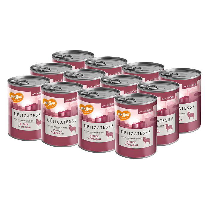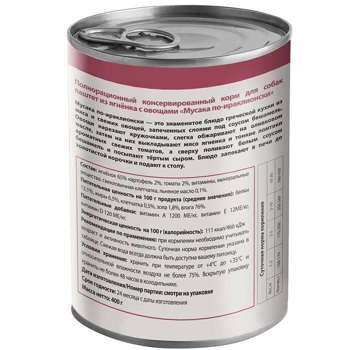 Полнорационный консервированный корм для собак всех пород "Мусака по-ираклионски". Паштет из ягнёнка с овощами. Суперпремиальный паштет с высоким содержанием мяса, созданный по мотивам культовых рецептов разных стран, адаптированных под собак всех пород. Мусака по-ираклионски — это знаменитое блюдо греческой кухни из мяса и свежих овощей, запеченных слоями под соусом бешамель. Овощи нарезают кружочками, слегка обжаривают на оливковом масле, затем на них выкладывают мясо ягненка и тонкие ломтики ароматных свежих томатов, а сверху поливают белым соусом бешамель и посыпают тёртым сыром. Блюдо запекают в печи до золотистой корочки и подают к столу.