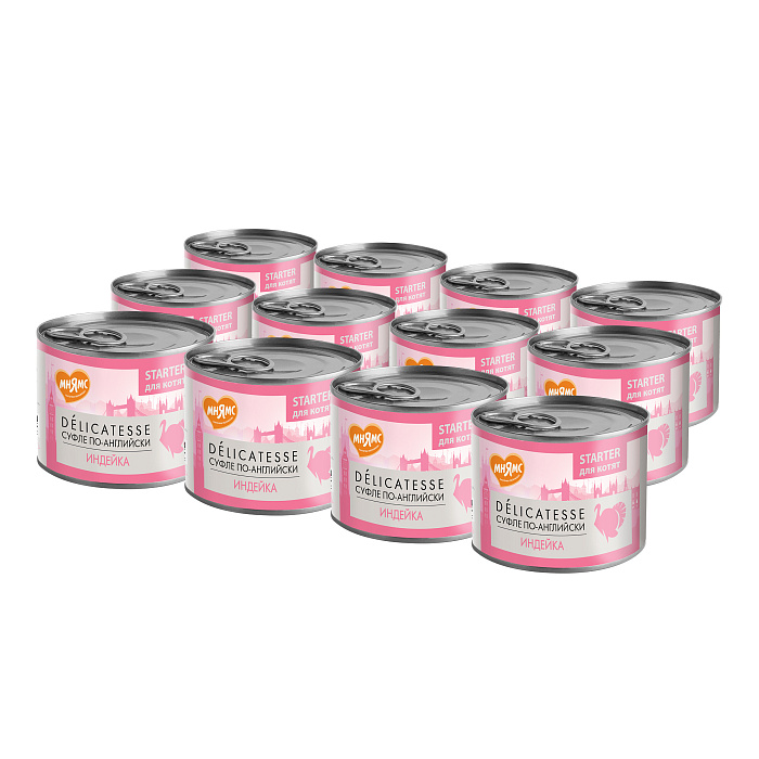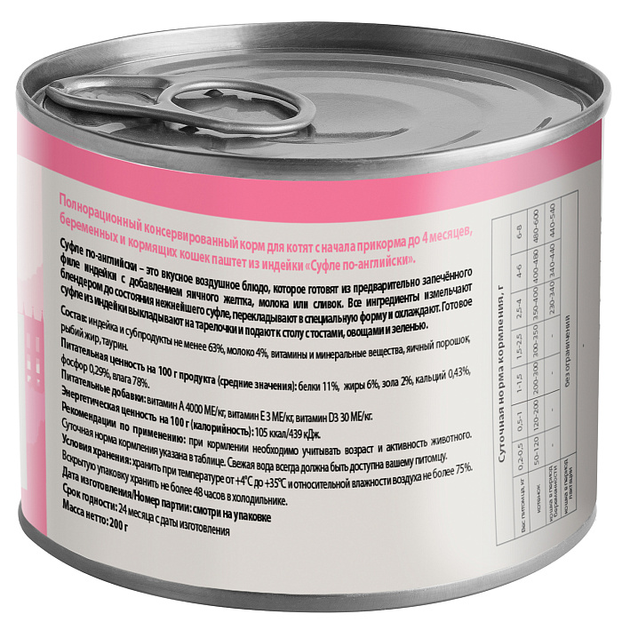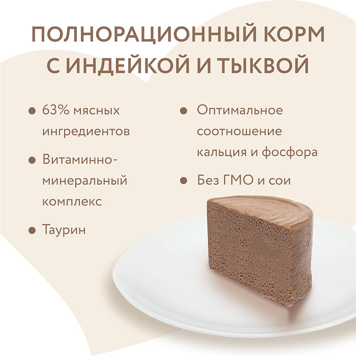 Состав: индейка и субпродукты не менее 63%, молоко 4%, витамины и минеральные вещества, яичный порошок, рыбий жир, таурин.