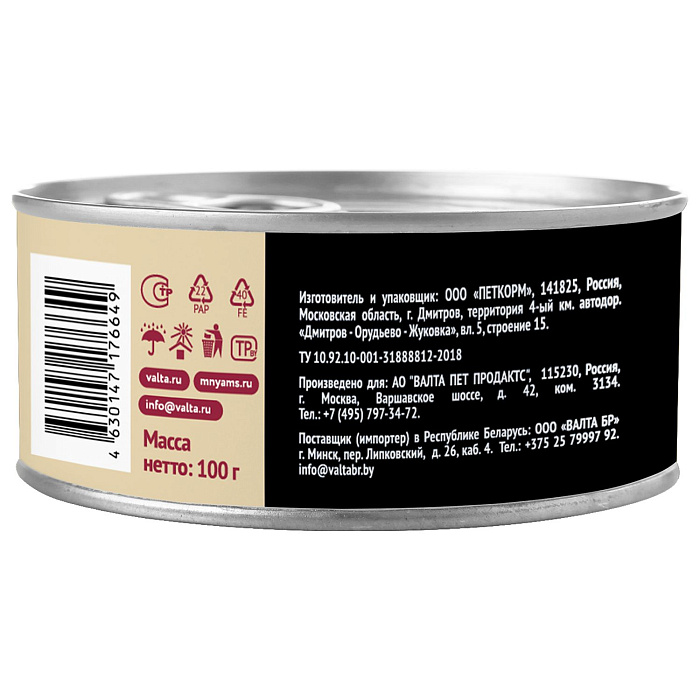Состав: мясо и мясные субпродукты 69% (в том числе телятина 4%), овощи (тыква, морковь), молоко, масло подсолнечное, витамины и минералы, кальций, таурин.