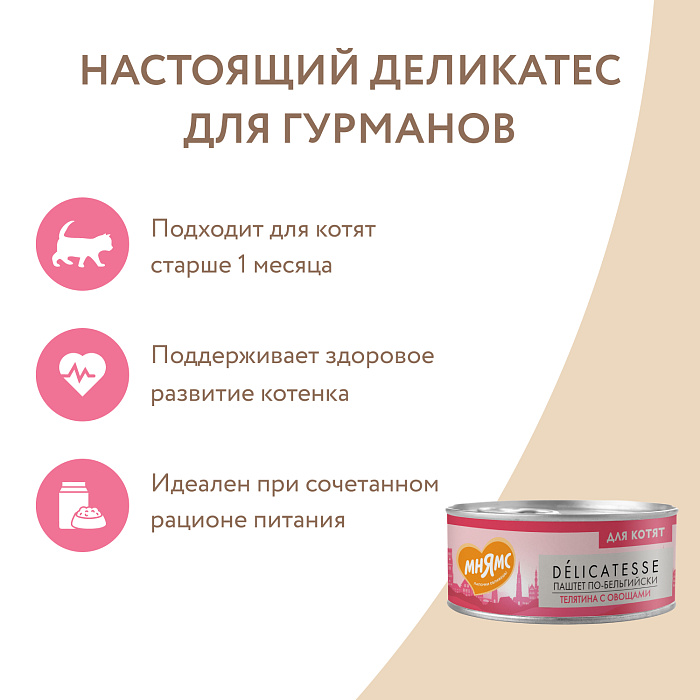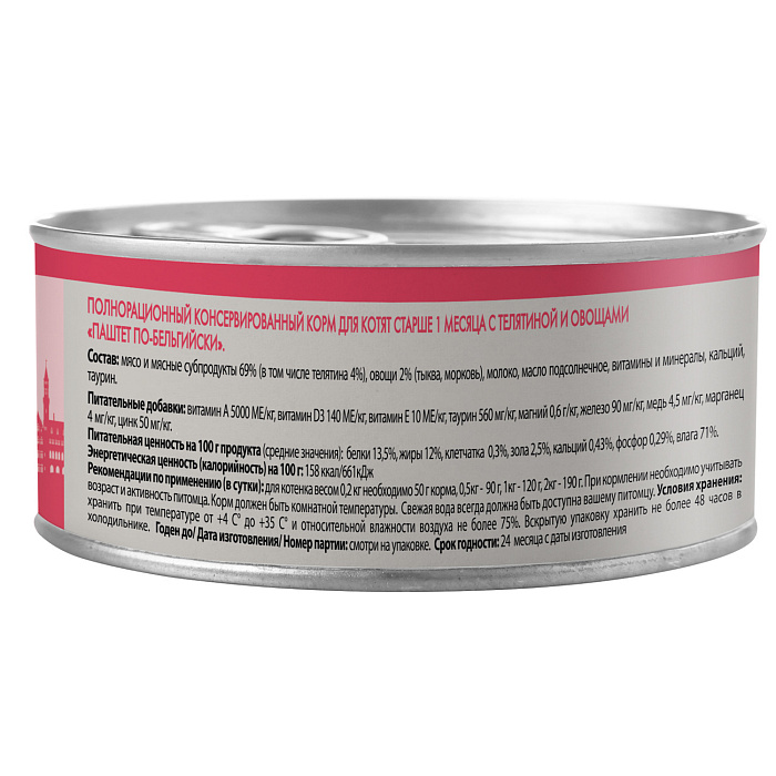 Полнорационный сбалансированный влажный корм с телятиной и овощами для котят старше 1 месяца, созданный по мотивам блюд высокой кухни. "Паштет по-бельгийски" содержит высокое количество животного белка (69%), молоко, кальций, таурин, а также все необходимые витамины и минералы, обеспечивающие рост и правильное развитие котенка. Без ГМО, сои, искусственных красителей и ароматизаторов.