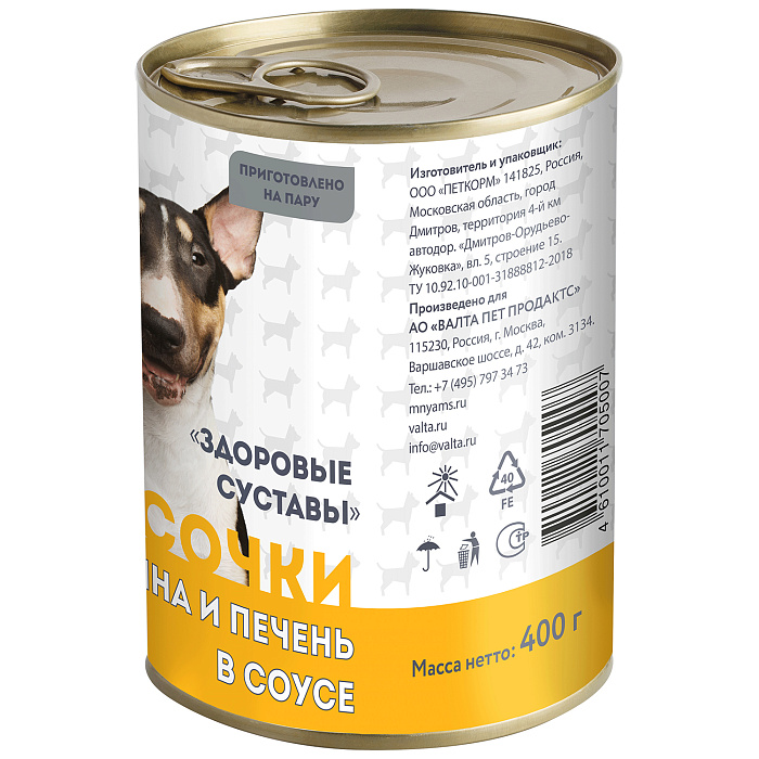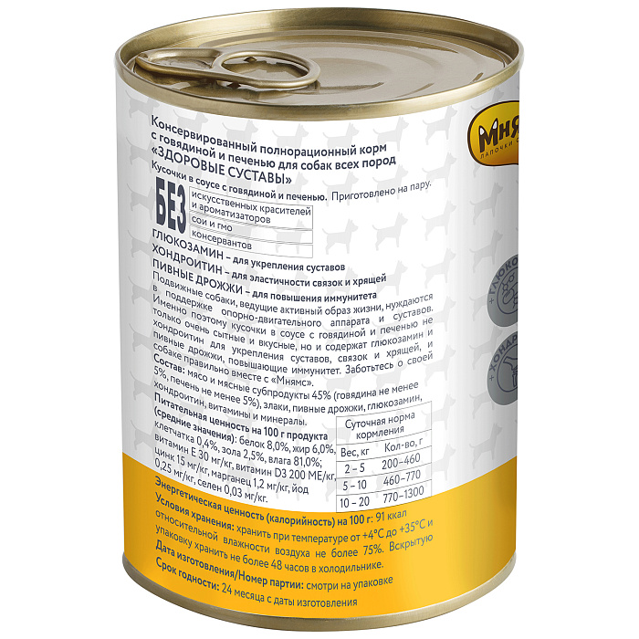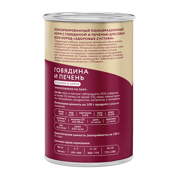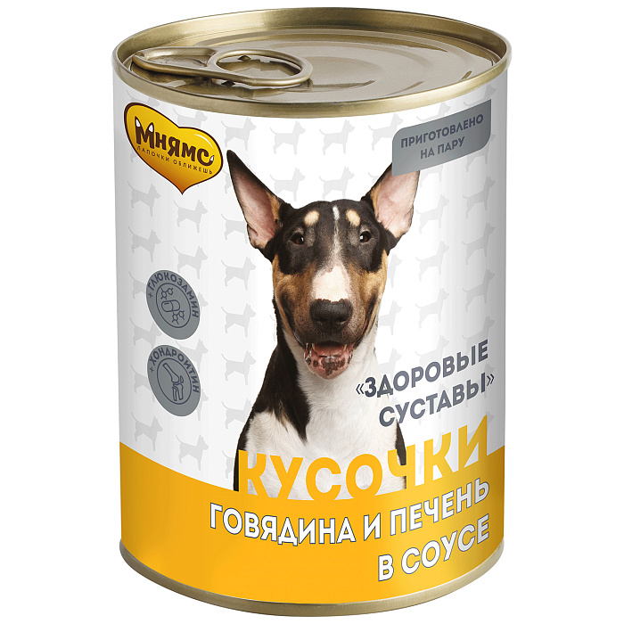 Подвижные собаки, ведущие активный образ жизни, нуждаются в поддержке опорно-двигательного аппарата и суставов. Именно поэтому кусочки в соусе с говядиной и печенью не только очень сытные и вкусные, но и содержат глюкозамин и хондроитин для укрепления суставов, связок и хрящей, и пивные дрожжи, повышающие иммунитет. Заботьтесь о своей собаке правильно вместе с «Мнямс».