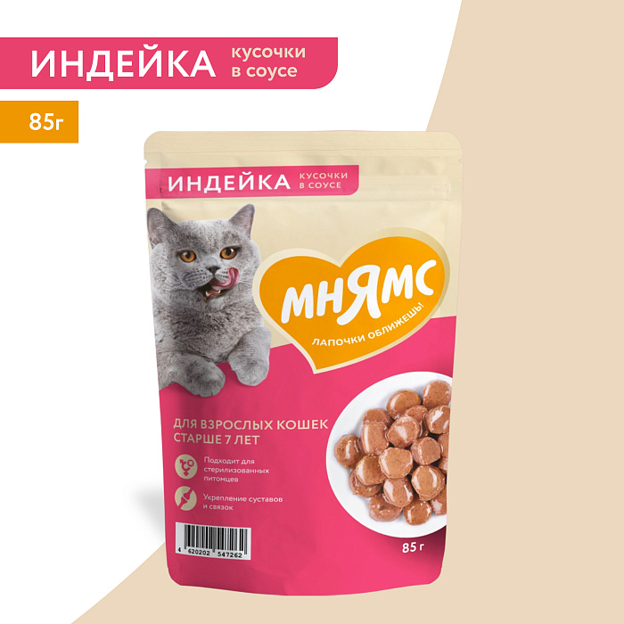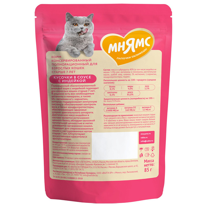 Высококачественный полнорационный сбалансированный влажный корм с индейкой подходит для взрослых кошек старше 7 лет. В рационе есть все необходимые витамины и минералы, а также DL- метионин и L- карнитин, которые поддерживают иммунную систему и обеспечивают контроль веса, а также хондропротекторы, обеспечивающие здоровье опорно-двигательного аппарата. Диетическое мясо индейки в составе является источником ценного белка, обладает высокой питательной ценностью и легко усваивается организмом кошки. Отсутствуют искусственные красители и ароматизаторы.