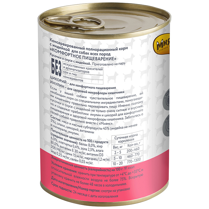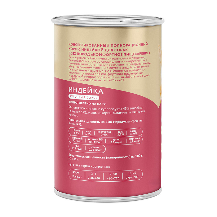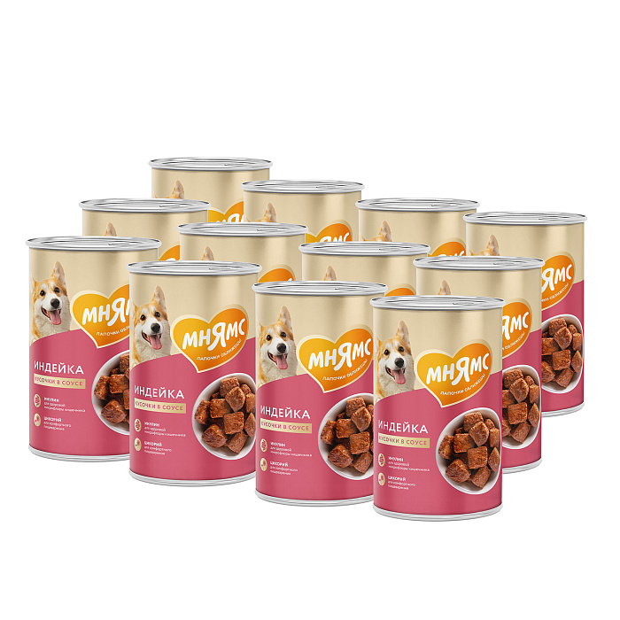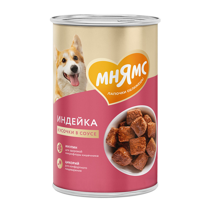 Если у вашей собаки чувствительное пищеварение, ей необходим корм со специальными ингредиентами, помогающими кишечнику правильно переваривать пищу. Именно поэтому кусочки в соусе с индейкой не только очень сытные и вкусные, но и содержат пребиотики инулин и цикорий для комфортного пищеварения и здоровой микрофлоры кишечника. Заботьтесь о своей собаке правильно вместе с «Мнямс».
