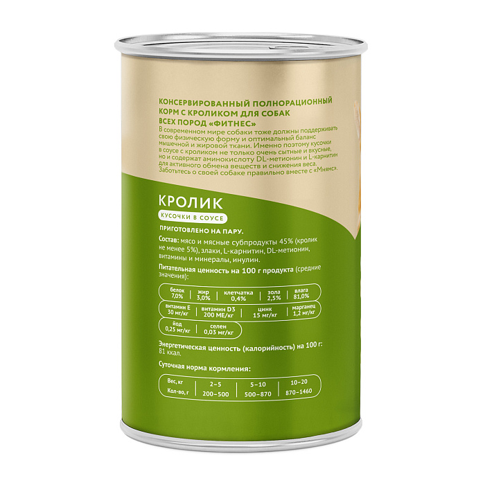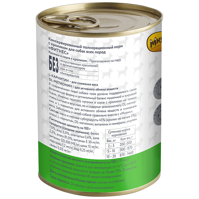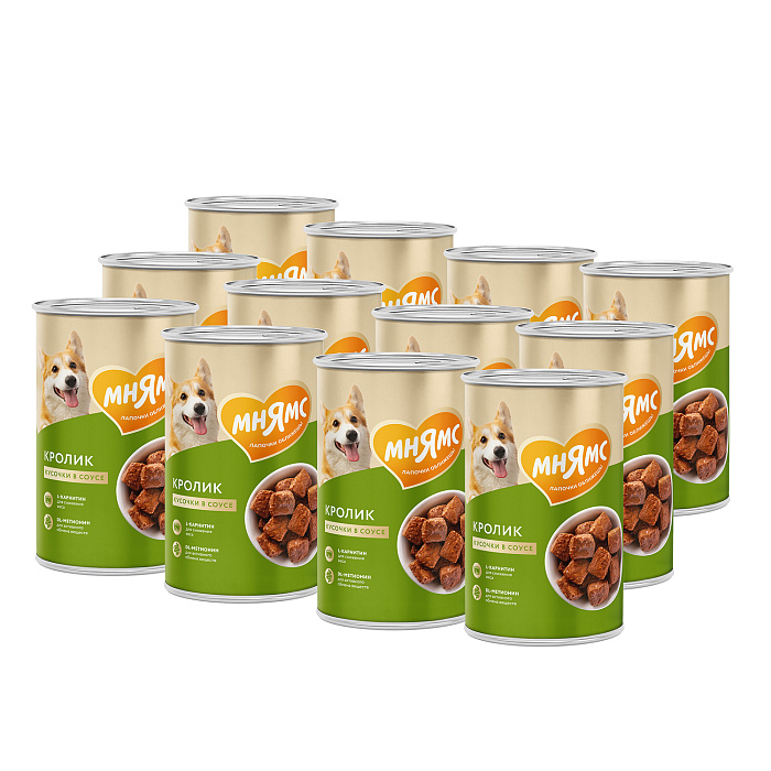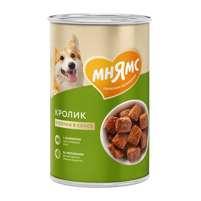 В современном мире собаки тоже должны поддерживать свою физическую форму и оптимальный баланс мышечной и жировой ткани. Именно поэтому кусочки в соусе с кроликом не только очень сытные и вкусные, но и содержат аминокислоты L-carnitine и DL-метионин для активного обмена веществ и снижения веса. Заботьтесь о своей собаке правильно вместе с «Мнямс».