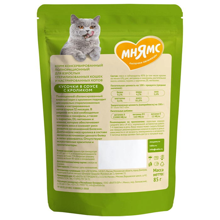 Высококачественный полнорационный сбалансированный влажный корм с кроликом подходит для взрослых стерилизованных кошек и кастрированных котов старше 12 месяцев.