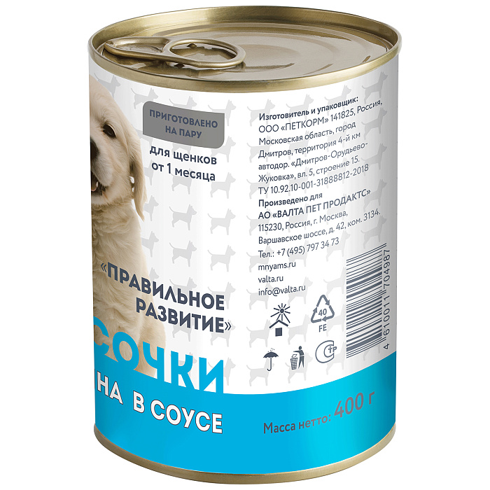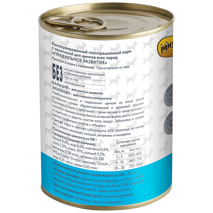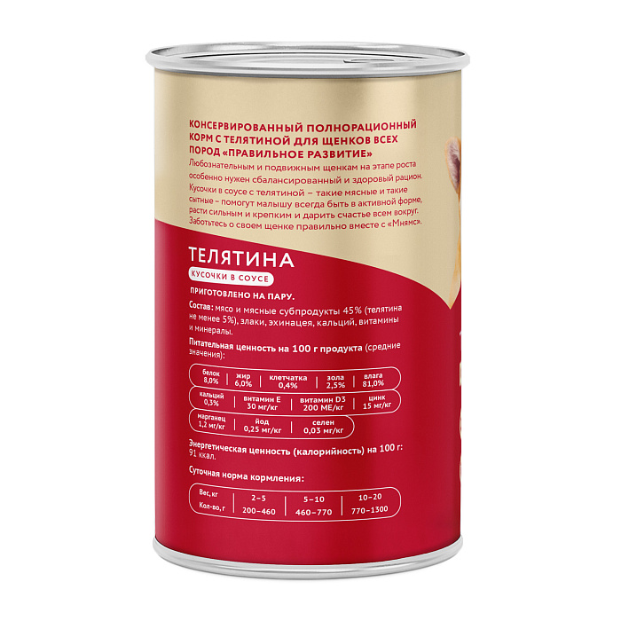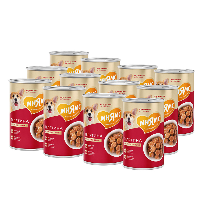 Любознательным и подвижным щенкам на этапе роста особенно нужен сбалансированный и здоровый рацион. Кусочки в соусе с телятиной – такие мясные и такие сытные – помогут малышу всегда быть в активной форме, расти сильным и крепким и дарить счастье всем вокруг. Заботьтесь о своем щенке правильно вместе с «Мнямс».