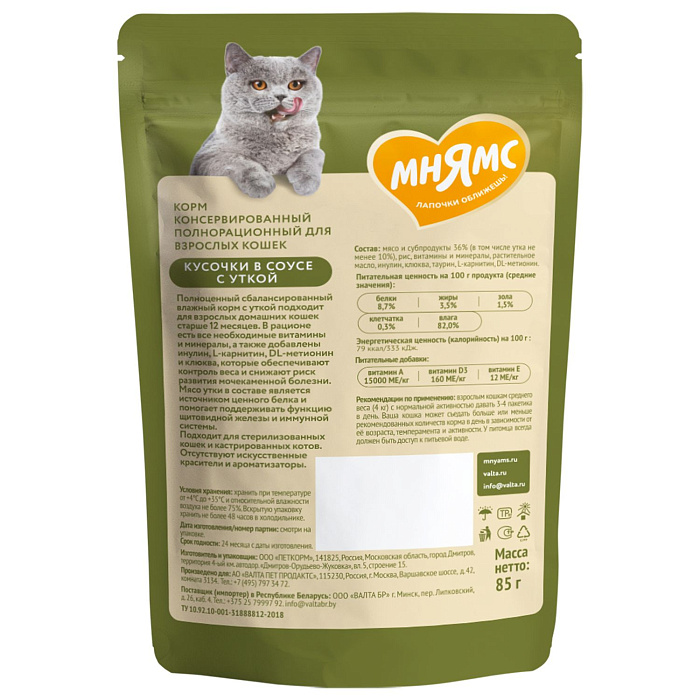 Мясо утки в составе является источником ценного белка и помогает поддерживать функцию щитовидной железы и имунной системы. Подходит для стерилизованных кошек и кастрированных котов. Отсутствуют искусственные красители и ароматизаторы.