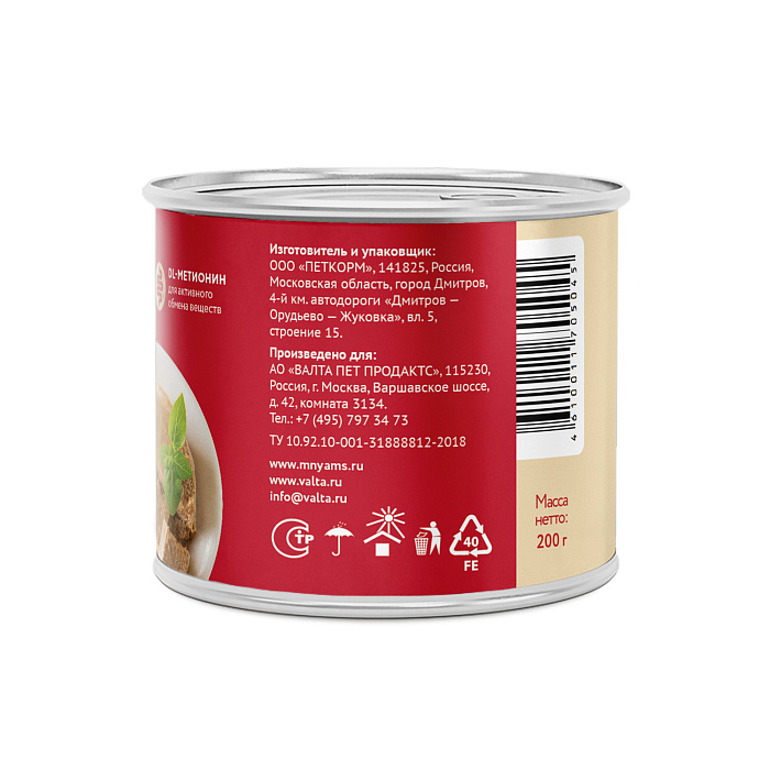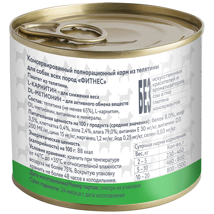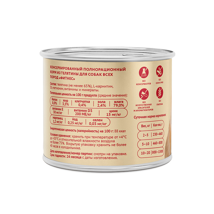 Состав: телятина (не менее 65%), L-карнитин, DL-метионин, витамины и минералы.